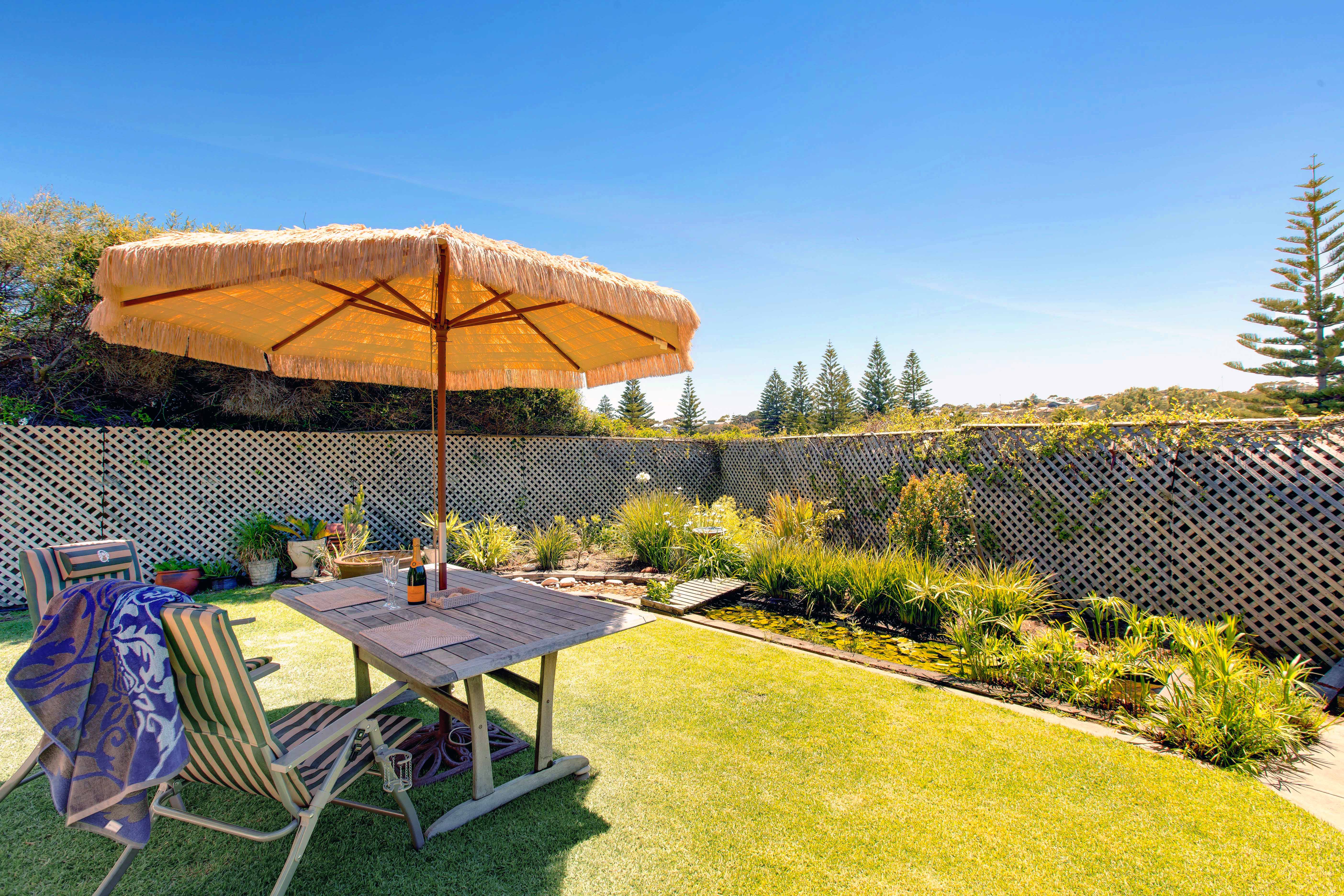 3 bedroom, 2 storey townhouse set right on the beach with huge balconies on both levels Large 6 person cedar spa on upperdeck with 2 sun lounges. Lower deck with Beautifully appointed lounge and dining with designer furniture and leather lounge suite, Modern kitchen with outlook to the sheltered and private rear lawn and garden. Extra large 3rd bedroom with desk and study area opening to the private and very sheltered rear garden. Weber BBQ, large outdoor setting and umbrella. Ideal for entertaining after the beach.